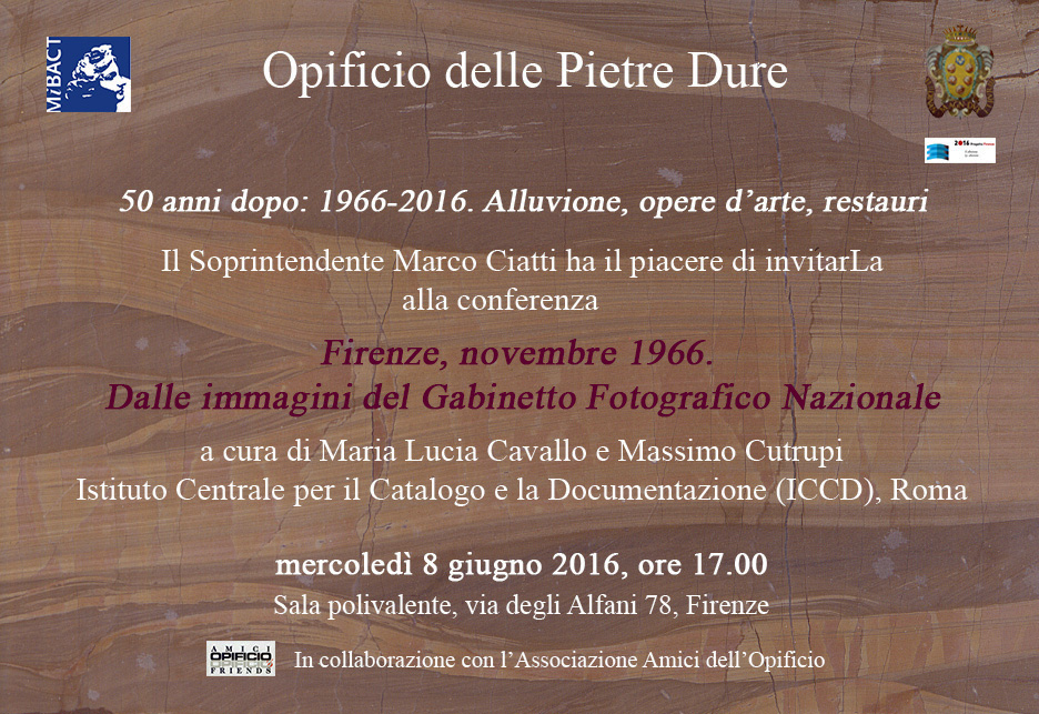 Nell’ambito delle celebrazioni per ricordare il cinquantenario dell’alluvione di Firenze del 1966, l’Opificio delle Pietre Dure organizza, in collaborazione con l’Associazione Amici dell’Opificio, a cadenza mensile, il mercoledì pomeriggio, una serie di incontri sul tema: 50 anni dopo: 1966-2016. Alluvione, opere d’arte, restauri.